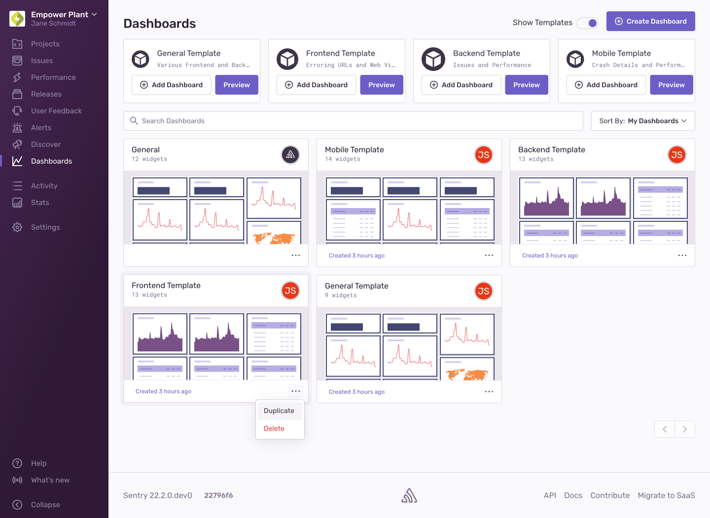 When the "Show Templates" toggle is enabled, several default dashboard templates are displayed. You can add each template directly to the list of dashboards by clicking "Add Dashboard", or preview it by clicking "Preview". You have to add a template before you can edit the resulting dashboard. You can also duplicate or delete a dashboard created from a template (this does not delete the template).