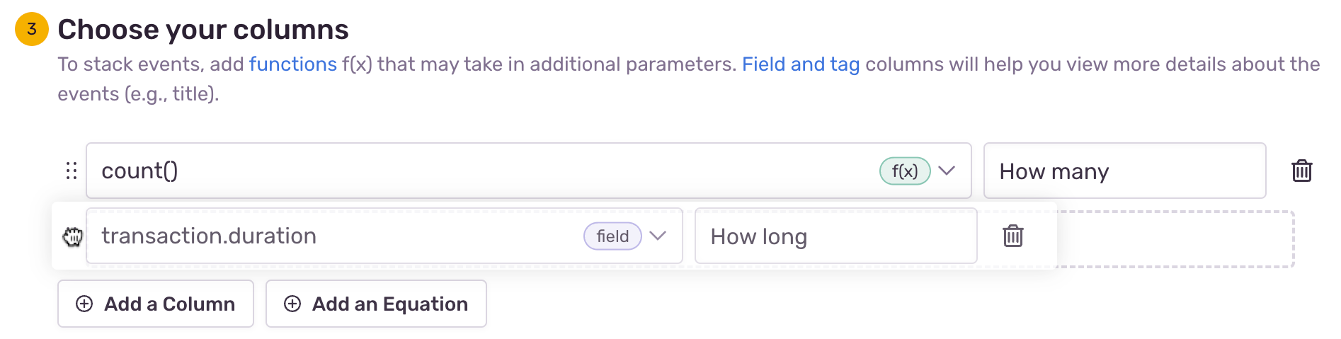 By default, the first column is already configured for you, but you can update it. To add more columns, which stacks events, add functions (f(x)