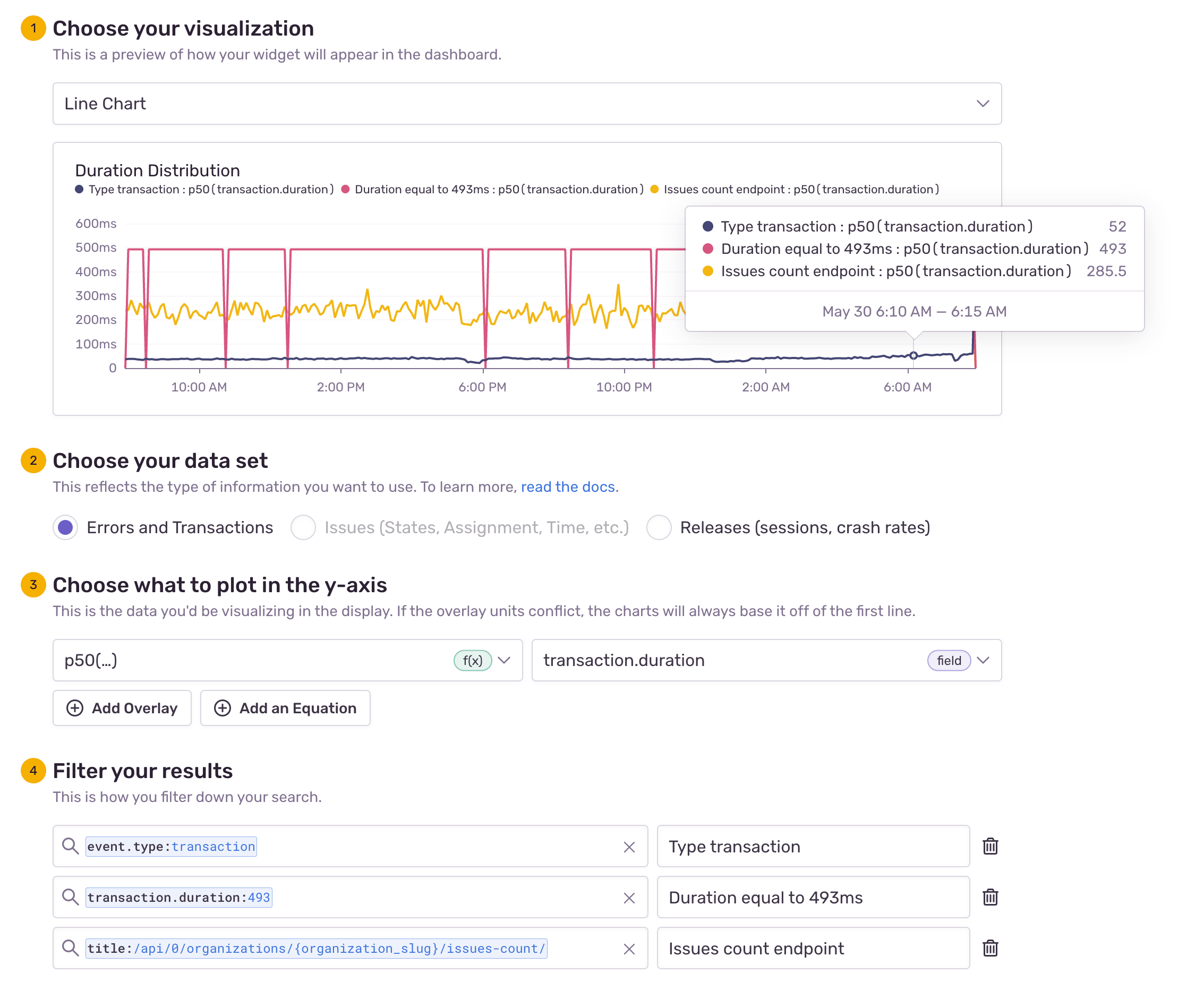 Choosing "Transactions" allows you to query and aggregate transaction events in the same way you would for a Discover Query. This data is comprised of events that track the performance of operations in your application. Some widget examples include: