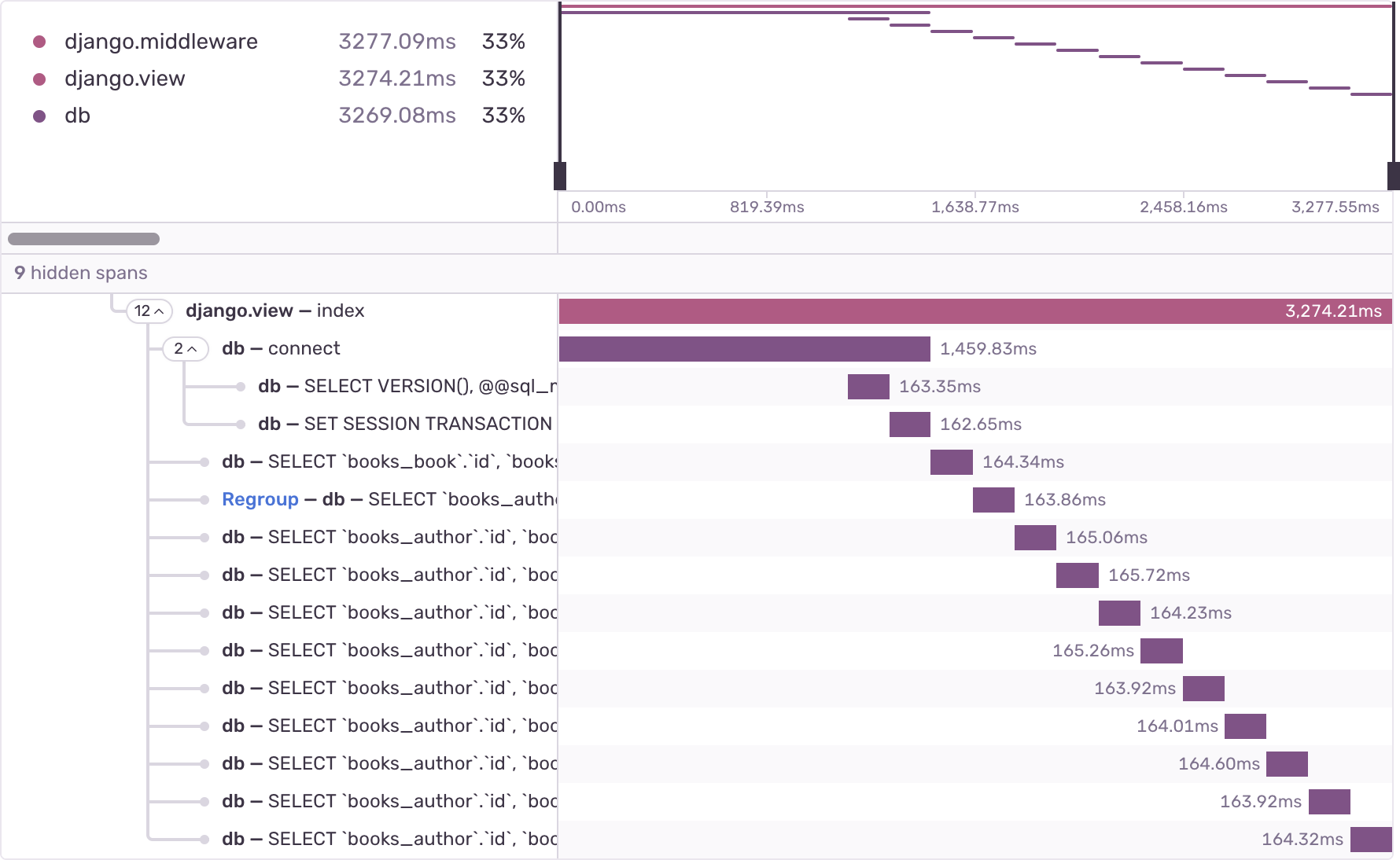 This code has a subtle performance problem. Each call to book.author.name makes a query to fetch the book's author. In total, this code makes 11 queries: one query to fetch the list of books, and 10 more queries to fetch the author of each book. This results in a characteristic query span waterfall: